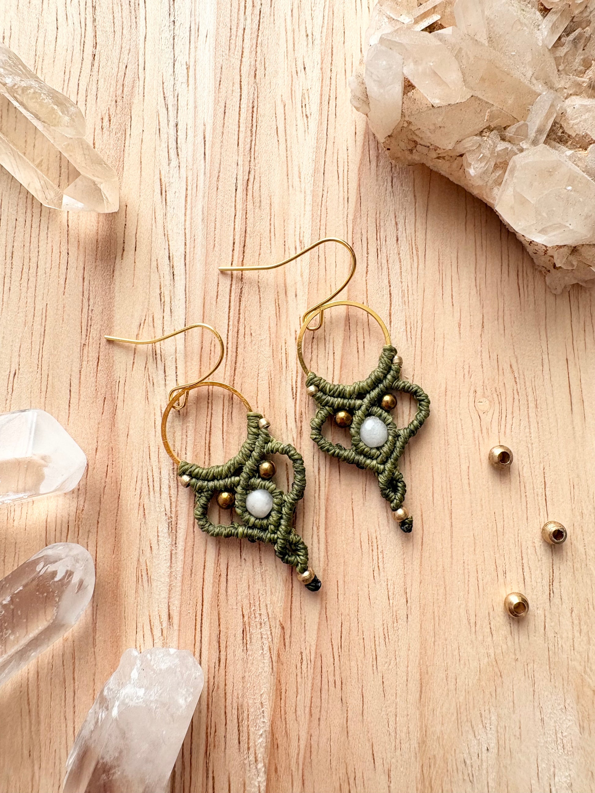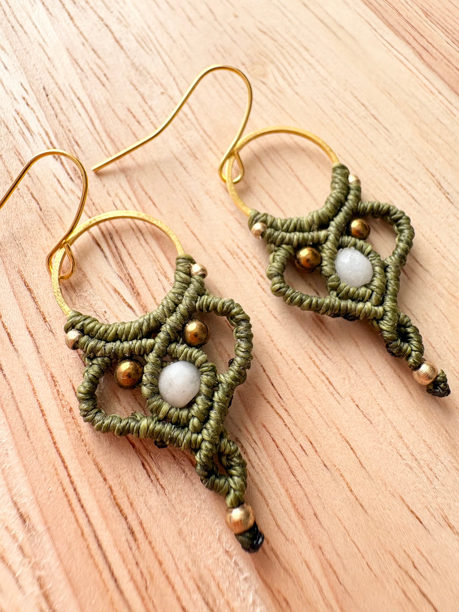 Amazoniet rust in het hart van deze ivoorkleurige macramé oorbellen als een kalme fluistering van binnenuit.