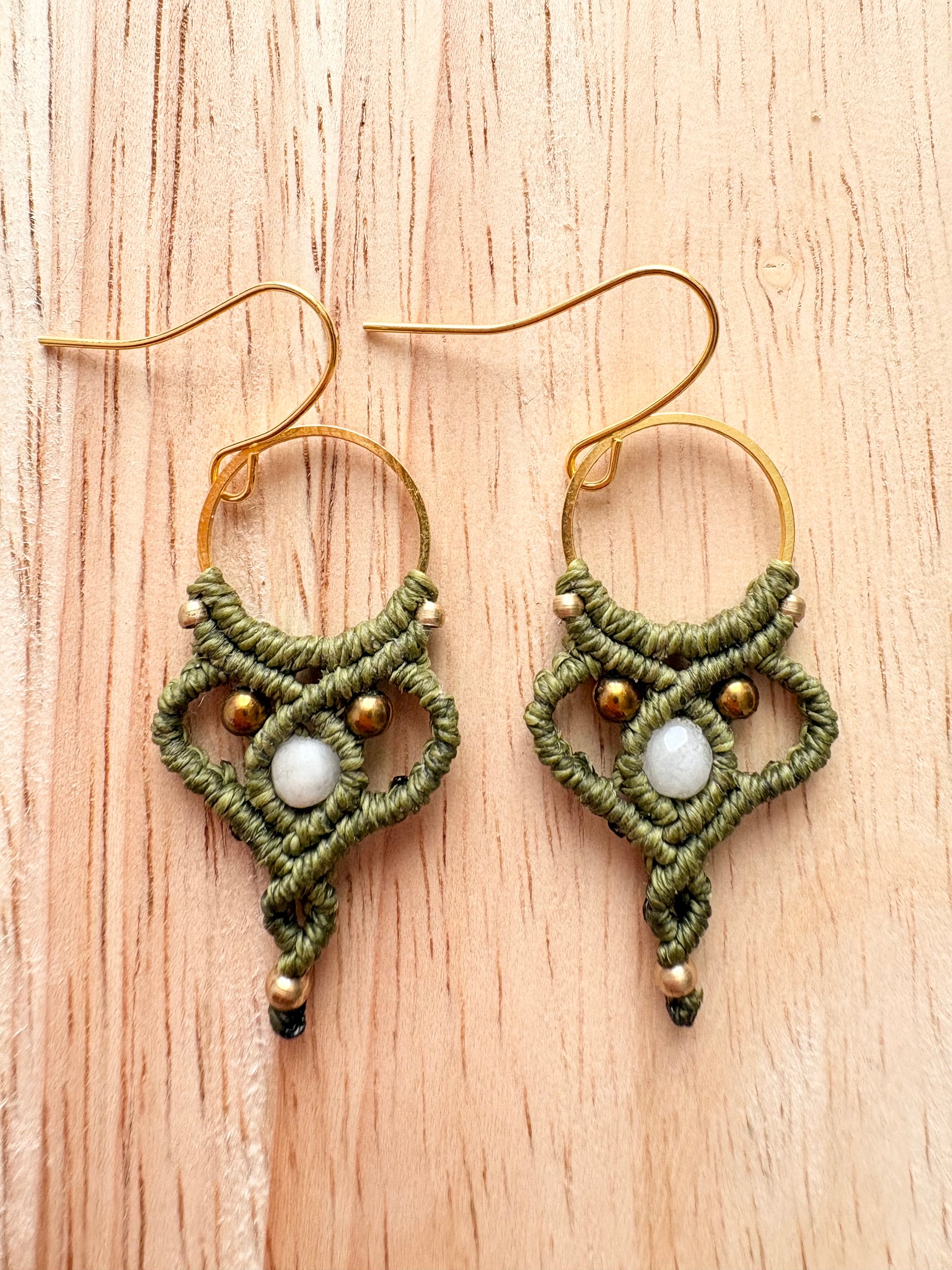 Handgeknoopte macramé in ivoorkleur • Amazoniet • Bronskleurige hematiet kralen • Messing kralen uit India • Goudkleurige oorhaakjes