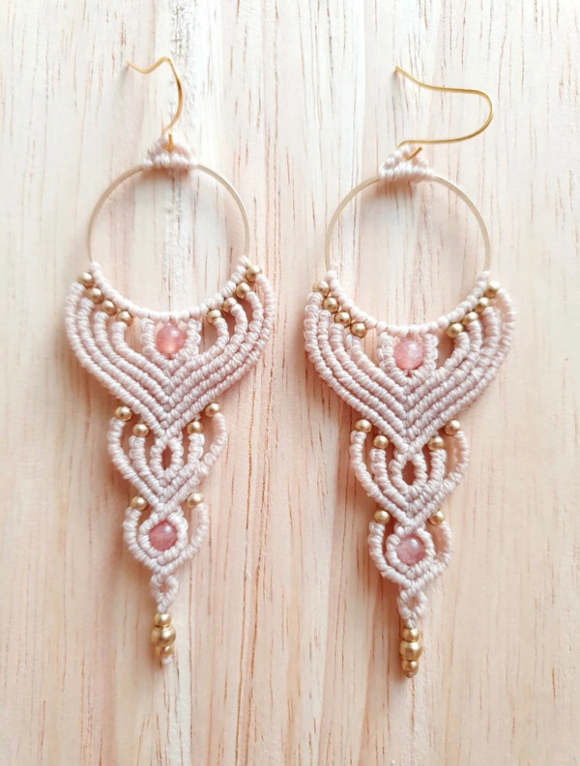 Aligned light - handgemaakte macramé oorbellen met zonnesteen en messing kralen