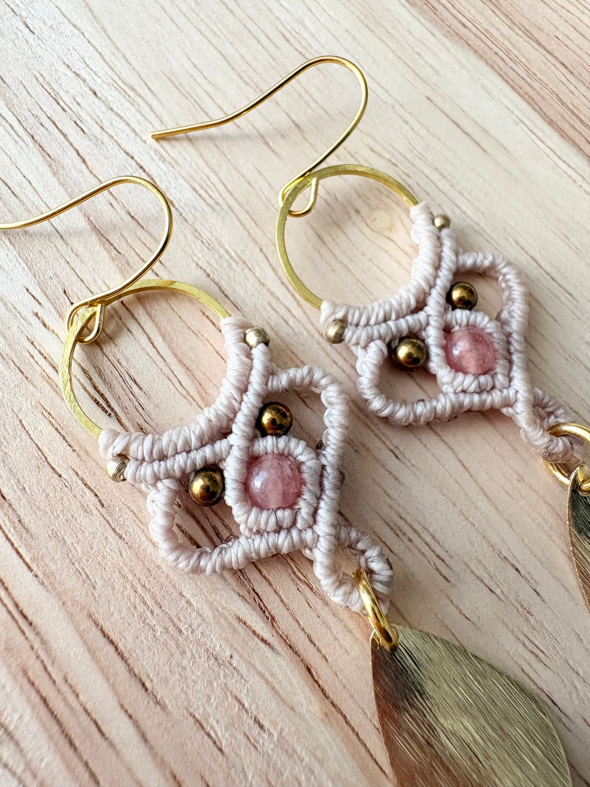 Blush & light - Handgemaakte macramé oorbellen met zonnesteen en hematiet