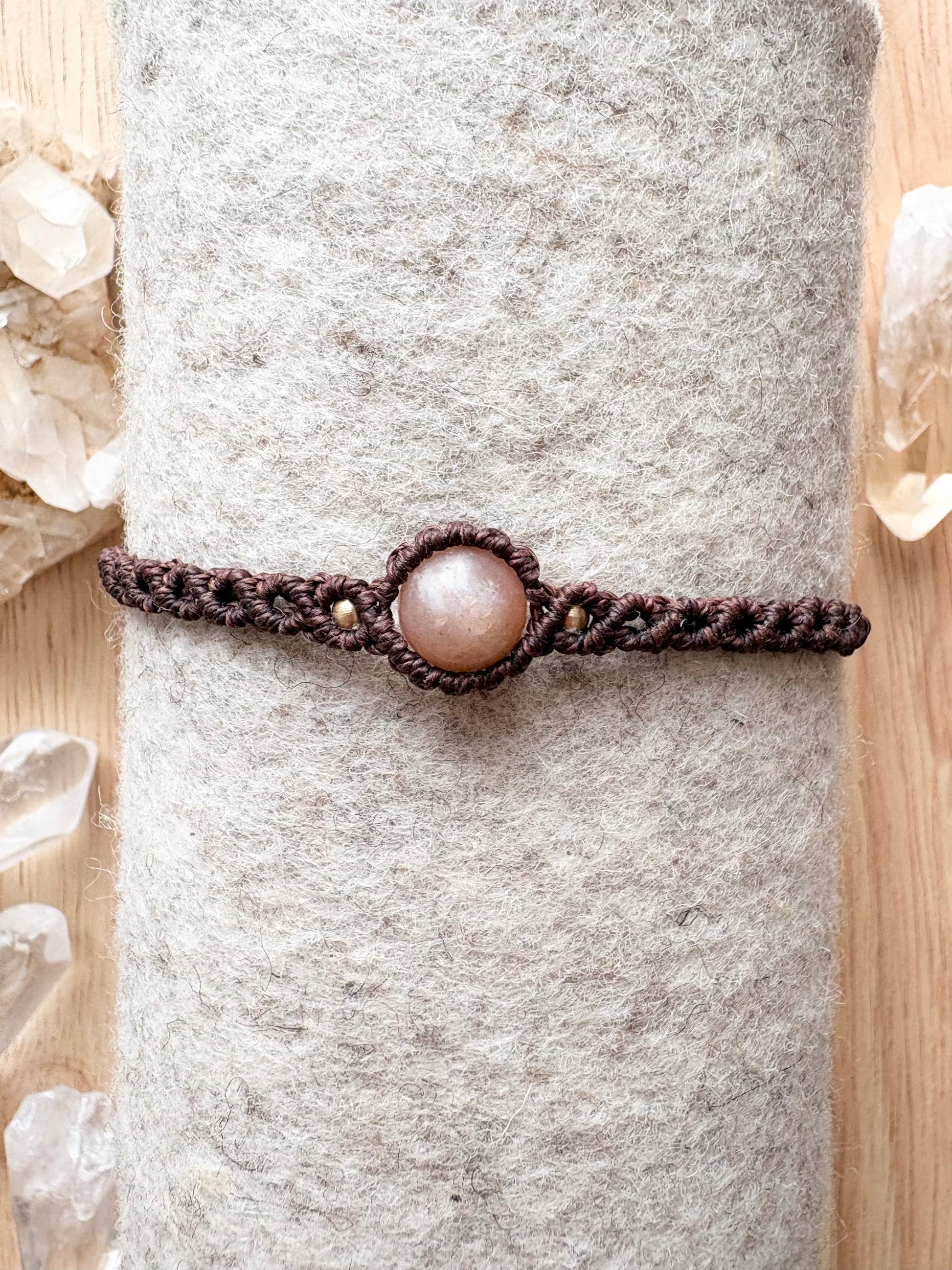 Deze handgeknoopte macramé armband combineert zonnesteen met warme messing accenten en een donkerbruin macramé koord dat een aardse, bohemian uitstraling geeft. Dankzij de verstelbare schuifsluiting past de armband zich moeiteloos aan jouw pols aan en draagt ze licht en comfortabel gedurende de dag.